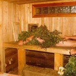 The sauna stove is placed in the far corner or near the entrance to provide quick access to the steam supply. A tank with cold and hot water is installed in the upper part of the room above the stove or replaced with a broiler from the outer wall of the washing room. A bathhouse with an attic looks more modern; a dining or coffee table is installed on the site. The glassed-in terrace is furnished with armchairs and a sofa.